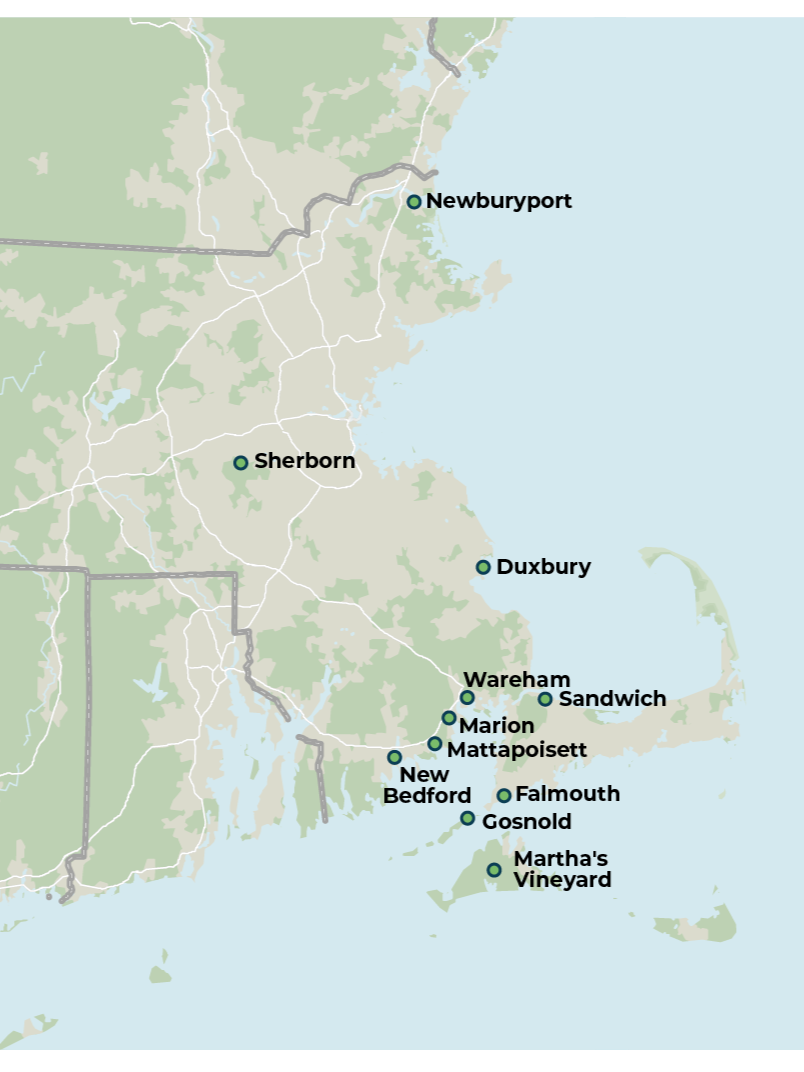 Our team is partnering with Wareham; Falmouth; Gosnold; Marion; Mattapoisett; Sandwich; Sherborn; Duxbury; New Bedford; Newburyport; and Martha's Vineyard Regional Commission.